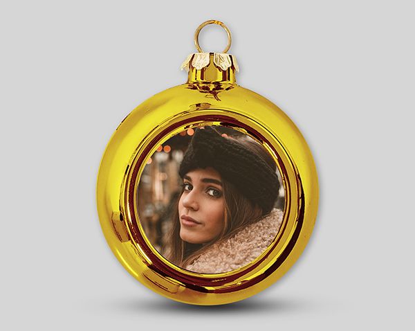 Vánoční ozdoba ve tvaru koule na stromeček s vlastním obrázkem uvnitř. Koule je lesklá v několika barevných variantách, vlastní obrázek je na rovném podkladu uvnitř ozdoby.