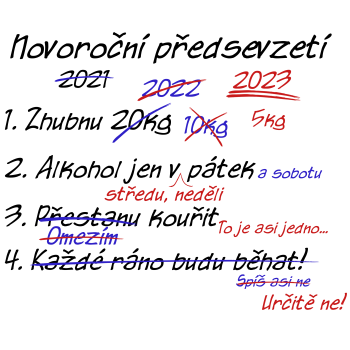 Tento obrázek humorně znázorňuje naše oblíbená novoroční předsevzetí, která se často nevyvedou podle plánu. Předsevzetí na rok 2023 tu hraje hlavní roli a staví se proti minulé a ne úplně úspěšné snaze z roku 2022. Na začátku je ambiciózní plán zhubnout, klasických 5 kg, což každý známe, ovšem s heslem „omezení“ to jde těžko. Dny jako středa a neděle jsou v tomto plánu prostě vyřízeny, vždyť to je asi jedno, ne? No a spaní? Určitě ne! Pokud chcete mít tento lehce chaotický, ale optimistický kousek doma, neváhejte si jej pořídit na tričko, hrníček nebo třeba jako motiv na zdi. Bude vám každý den připomínat, že smích je zdravější než dieta!